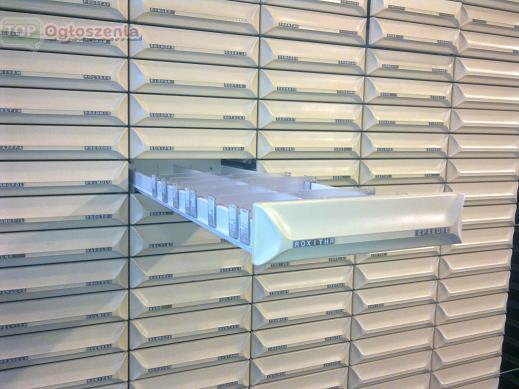 Sprzedam używane meble apteczne system głębokiego składowania w bardzo dobrym stanie. Zestaw zawiera w około 19 szuflad, szuflada wyposażona jest w przegrody i boczne opisy. Wykonujemy również nowe meble(regały, gabloty, stoły ekspedycyjne, szuflady głębokiego składowania) do aptek. Podana cena 1750 zł. netto dotyczy jednego pionu. Dostawa mebli pod wskazany adres >>>gratis<< 601/777-999 ; 602/777-999 ;052/320-77-55